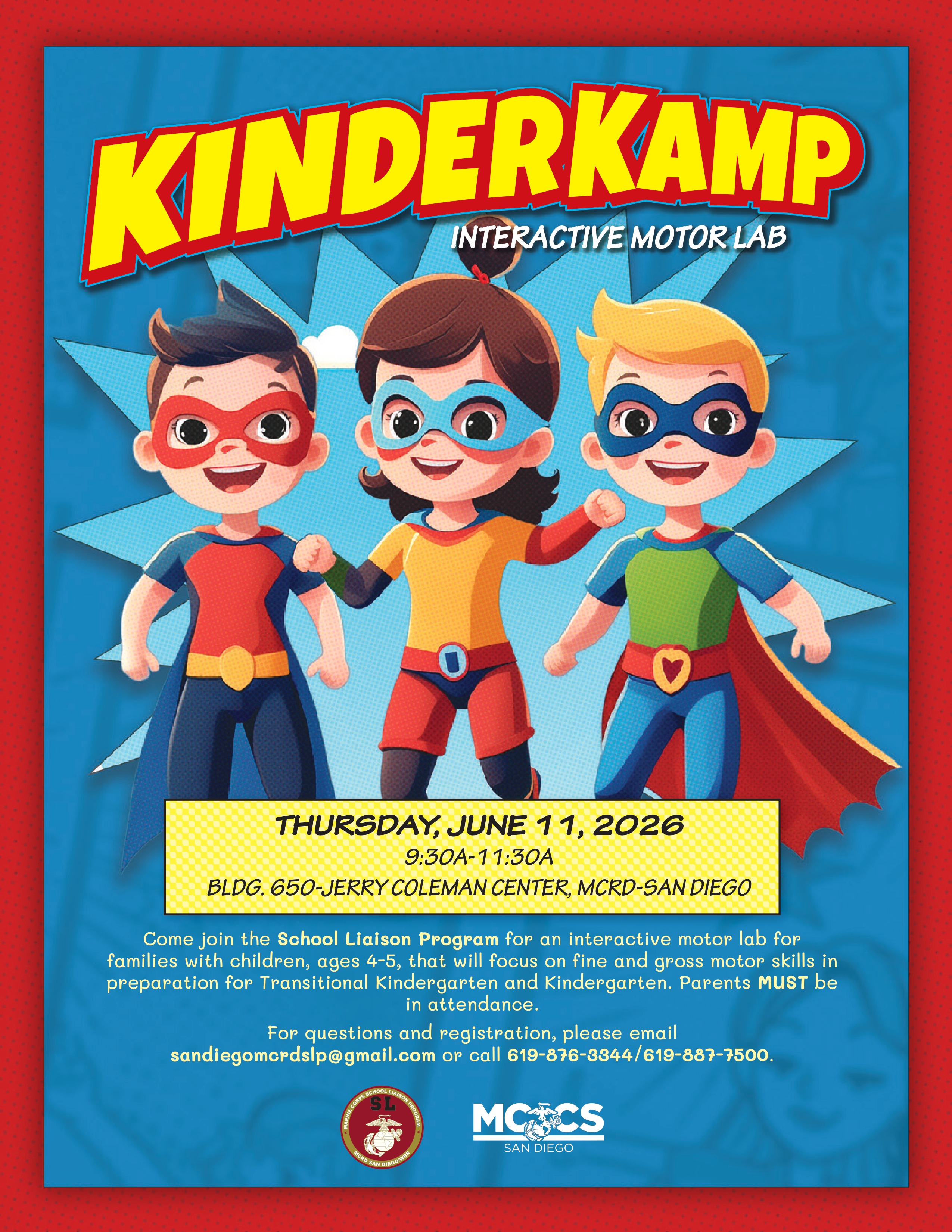 Come join the School Liaison Program for an interactive motor lab for families with children, ages 4-5, that will focus on fine and gross motor skills in preparation for Transitional Kindergarten and Kindergarten. Parent MUST be in attendance.
