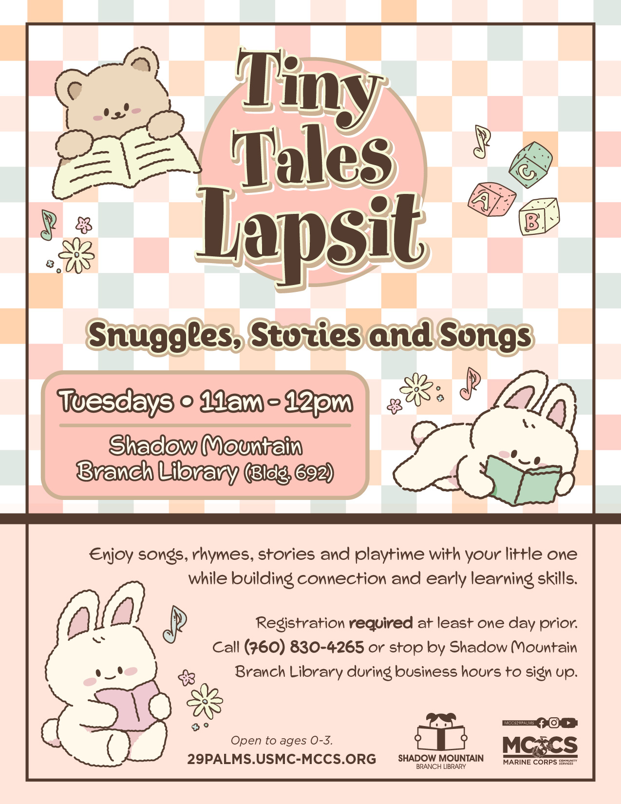 Registration required at least one day prior. Call (760) 830-4265 or stop by Shadow Mountain Branch Library during business hours to sign up.  (ages 0-3)