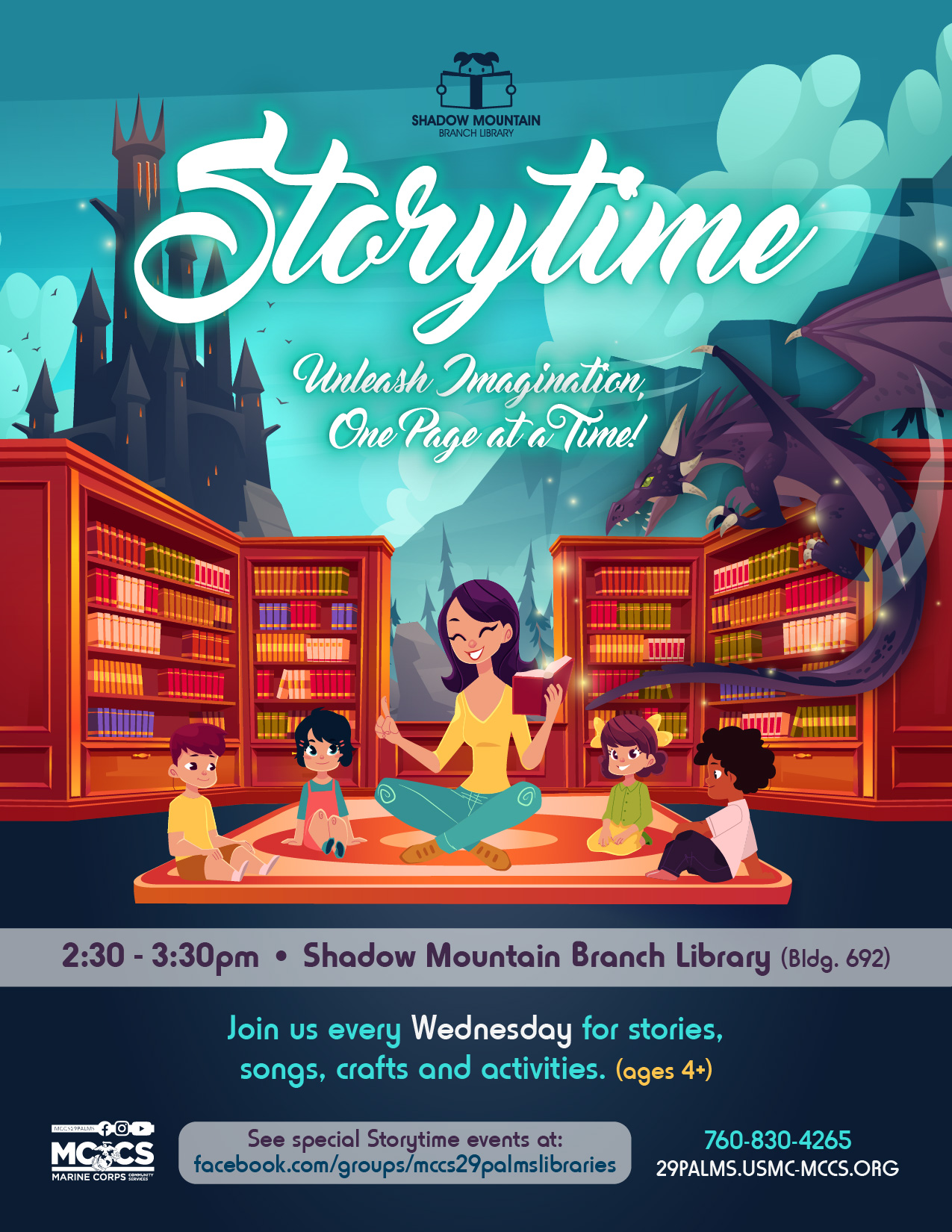 Join us every Wednesday from 2:30 - 3:30pm for stories, songs and activities. (ages 4+)