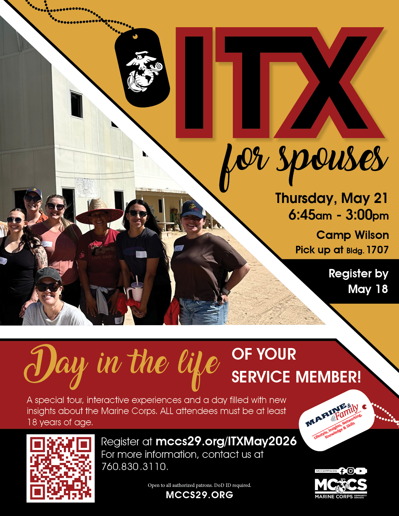 We will head out to Camp Wilson for a special tour, interactive experiences and a day filled with new insights. The event will start at Bldg. 1707 at 6:45am.